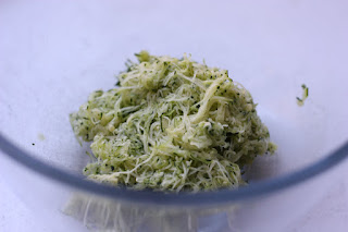 - Râper la courgette le plus finement possible, prélever environ 170g de chair et la presser entre vos mains pour retirer son jus.