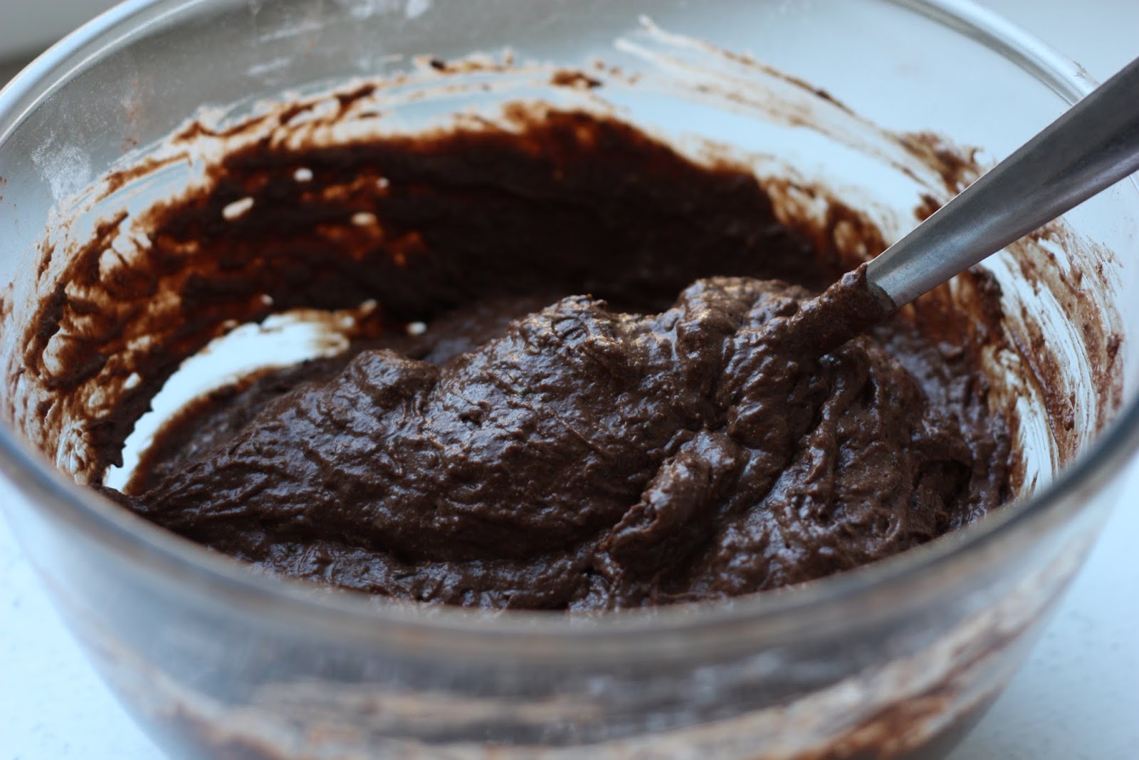 - Dans un saladier, mélanger ensemble la courgette râpée avec l’ensemble des ingrédients secs : farines, fécule, cacao, levure chimique, bicarbonate, sel et vanille.