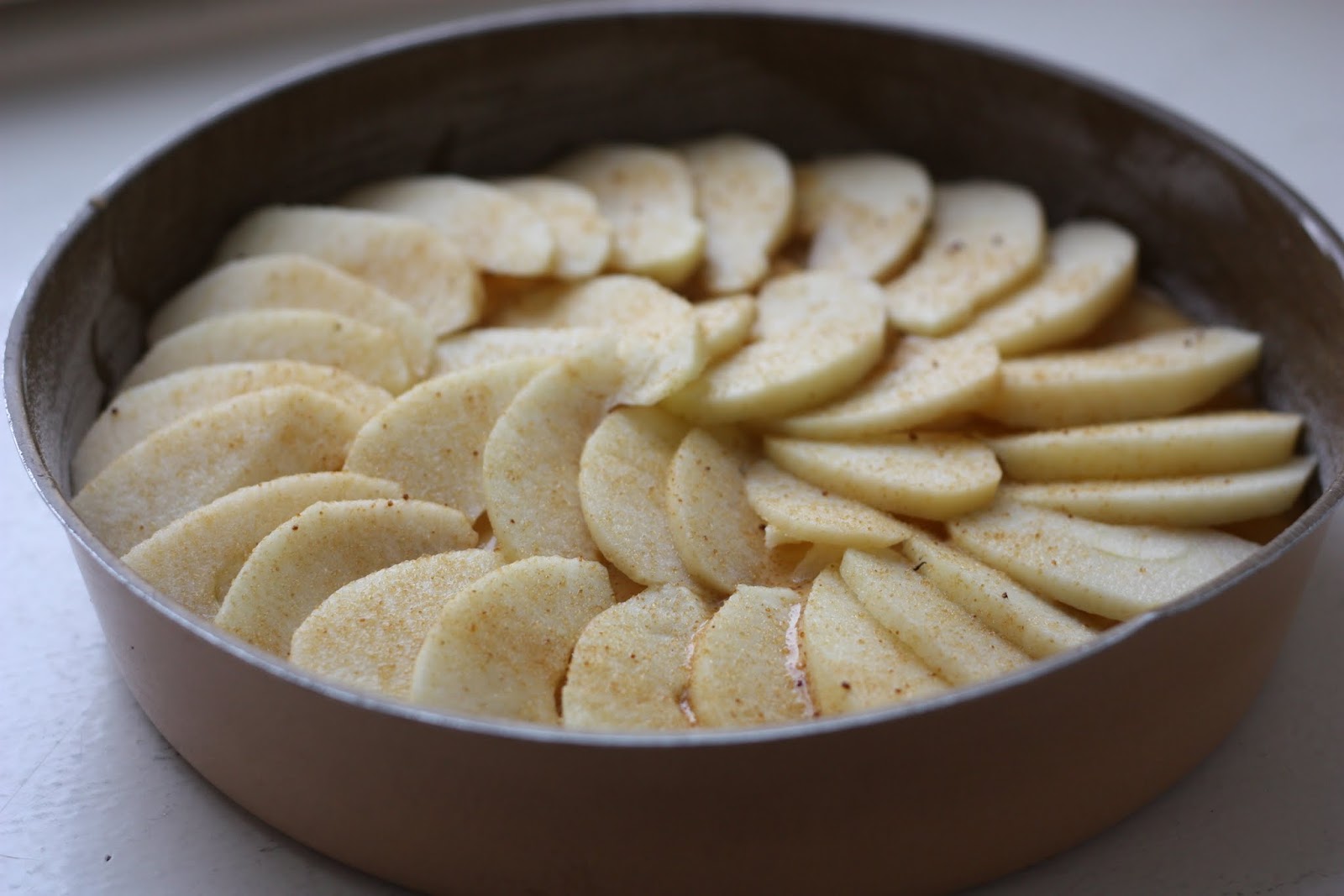 - Décorer le gâteau du ⅓ restant de pommes et éventuellement saupoudrer d’un peu de sucre roux.