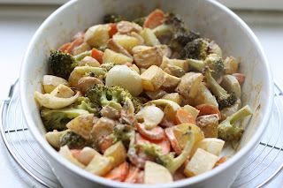 - Au bout de 40 minutes de cuisson environ, verser la moitié de la sauce sur les légumes, mélanger et enfourner de nouveau jusqu’à ce que les légumes soient cuits (les piquer avec un couteau pour tester).